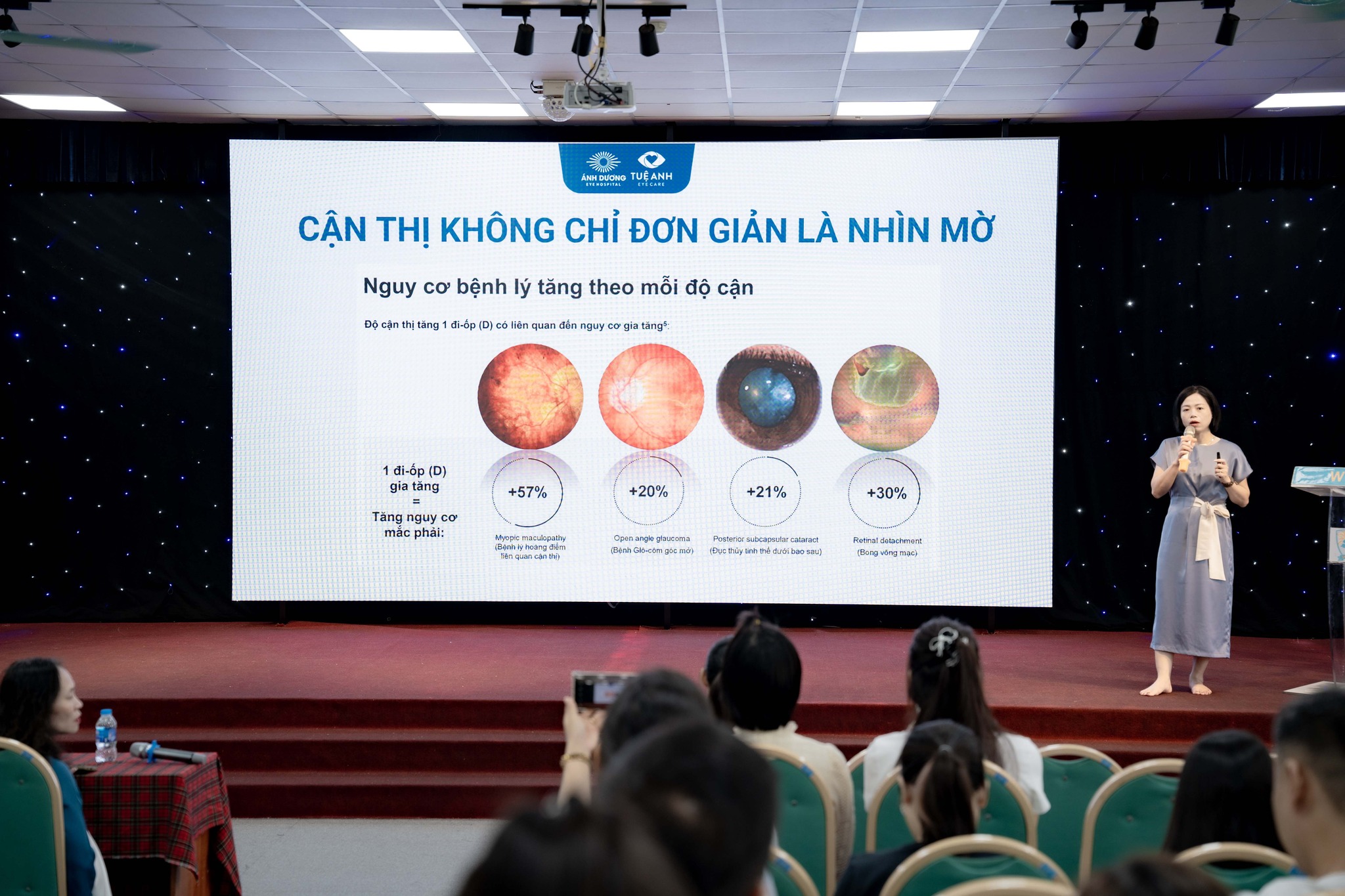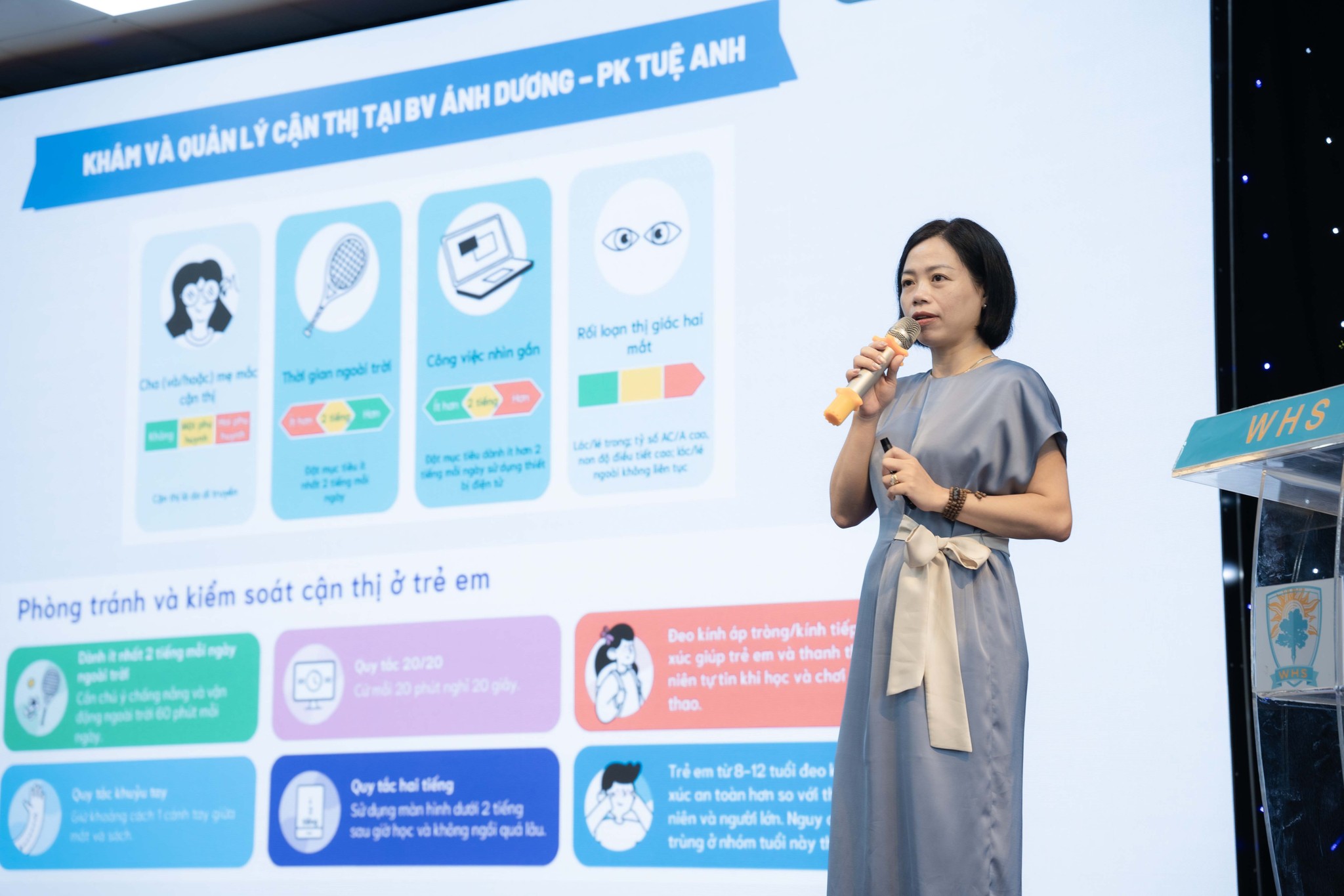 Tại buổi họp phụ huynh, ThS. BS Phạm Huyền Khanh - Tổng Giám đốc Bệnh viện Mắt Ánh Dương đã có phần chia sẻ đầy tâm huyết về tầm quan trọng của việc kiểm soát cận thị sớm. Bác sĩ nhấn mạnh: “Nếu chúng ta chỉ coi cận thị đơn thuần là chuyện phải đeo kính, thì đó là một sai lầm. Việc phát hiện và can thiệp sớm mới chính là chìa khóa để bảo vệ đôi mắt khỏe mạnh lâu dài cho trẻ em”.